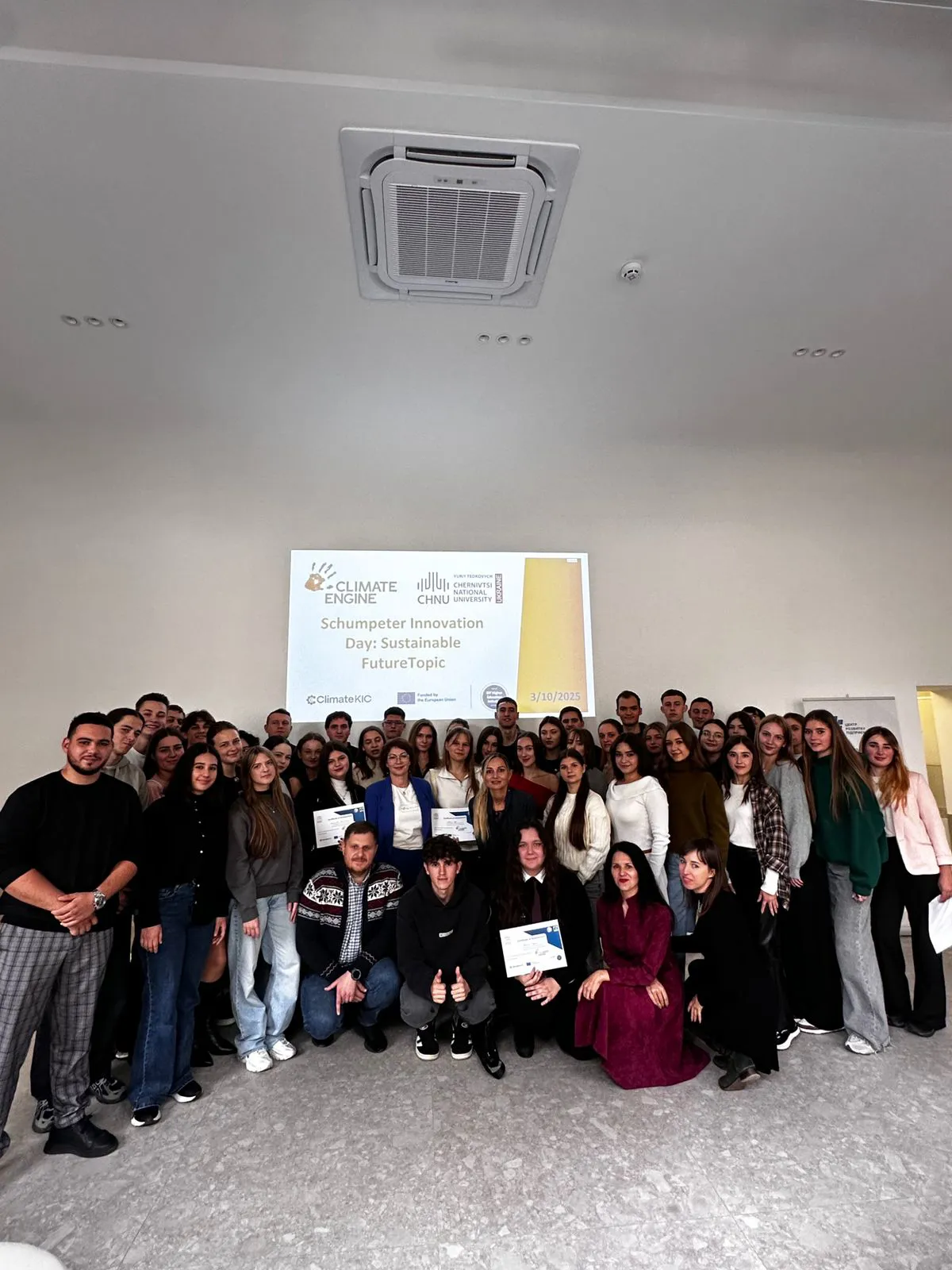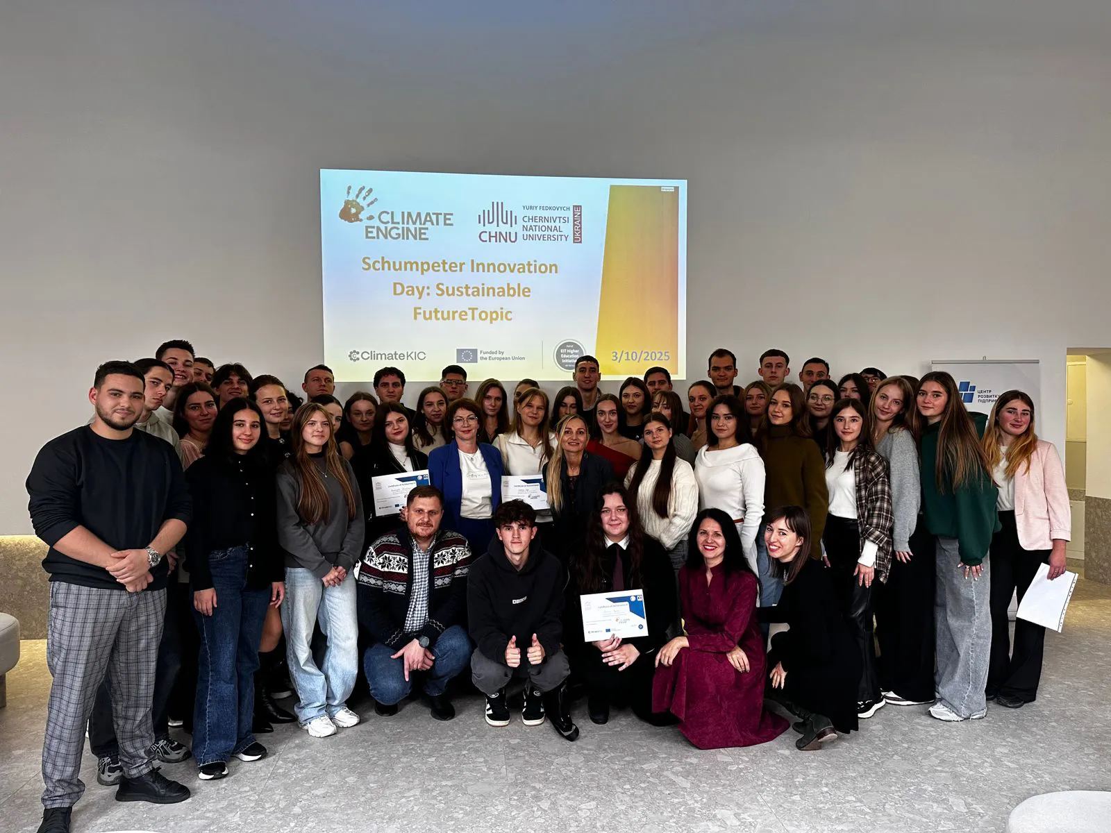 3 жовтня 2025 року в рамках Шумпетерівського форуму, організованого Чернівецьким національним університетом імені Юрія Федьковича у співпраці з Центром розвитку підприємництва, відбувся значущий захід, присвячений інноваціям та сталому розвитку. Студентська спільнота університету представила свої інноваційні ідеї спрямовані на вирішення екологічних проблем в рамках Climate Engine проєкту, підтримується Європейським Інститутом Інновацій та Технологій (EIT – European Institute of Innovation and Technology)та Climate-KIC)"Schumpeter Innovation Day: Sustainable Future".